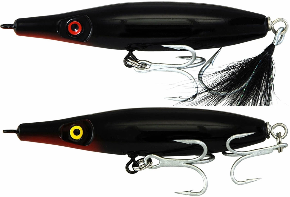 This stubby needlefish lure is great at getting out far. Use when finger mullet and small menhaden are present. Effective on many species from Bluefish of the Northeast to Peacock Bass in South America. Some folks like to fish these with a single feathered hook on the rear instead of the treble.