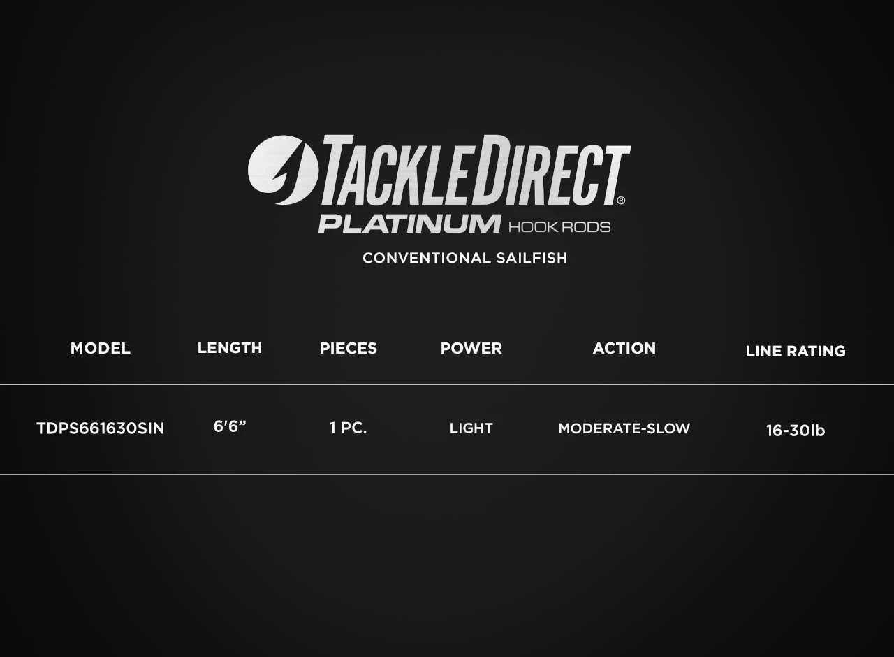 The TackleDirect TDPS661630SIN Platinum Hook Conventional Sailfish Rod is high performance and the result of stringent “on the water” design and testing by some of the finest sport anglers around the world. The TDPS661630SIN Conventional Stand Up Rod features a durable E-glass blank with a softer tip section geared towards a higher percentage of quality hooksets and less pulled hooks when targeting sailfish with circle hooks whether dead bait trolling or off of the kite. The heavy duty Fuji SIN (Silicon Nitride) guides allow for trouble free use with your favorite monofilament line. This rod is ideally paired with a 20lb class lever drag reel with a high speed retrieve in order to stay tight on a greyhounding sailfish off your stern.