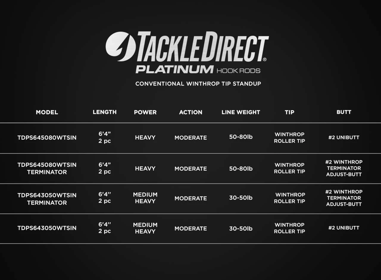 | Model | TDPS645080WTSIN – 6'4'' – 50-80lb (Aftco #2 Uni-Butt), TDPS645080WTSIN-Terminator – 6'4'' – 50-80lb (Winthrop Tackle #2 Terminator Butt), TDPS643050WTSIN-Terminator – 6'4'' – 30-50lb (Winthrop Tackle #2 Terminator Butt), TDPS643050WTSIN – 6'4'' – 30-50lb (Aftco #2 Uni-Butt) |