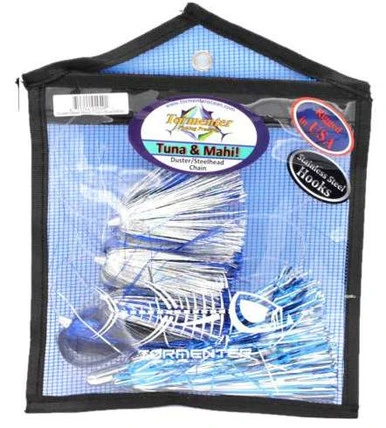 The Tormenter Duster Steel Head Chain is best for fishing Mahi. The dusters sparkle across the surface with the steel head trailing, immitating a small predator chasing small bait fish. This chain features four Tormenter dusters with a steelhead in the front on 130lb Momoi line with a super sharp, strong, dust resistant hook. This chain comes ready all set to fish with and comes in an 8×8 lure bag.